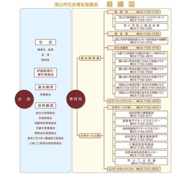 また、事業の円滑な推進を図るため、各自治会からご推薦いただきました流山市社会福祉協議会協力員の皆様にご協力をいただいています。※下記の組織図は令和2年度のものです。令和3年度版が出来次第、差し替えさせていただきます。