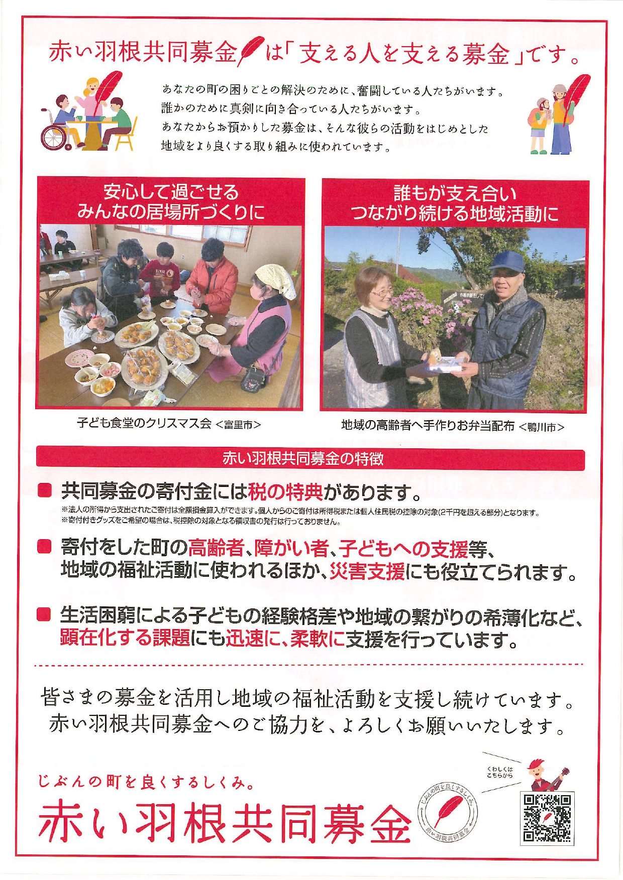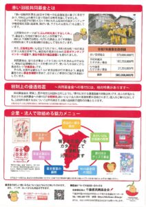 この募金は、戦後復興の一助として被災した福祉施設の支援を中心にスタートして以来、誰もが住みなれた地域で安心して暮らすことができるよう、さまざまな課題の解決に取り組む民間団体を応援する「じぶんの町を良くするしくみ。」として、取り組まれています。