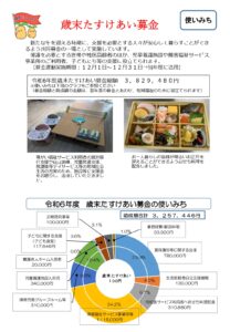 歳末たすけあい募金は、新たな年を迎える時期に、支援を必要としている方々が安心して暮らすことができるようにと、共同募金運動の一環として実施されています。お預かりした募金は、すべて流山市内で役立てられます。流山市社会福祉協議会を通じて、援助を必要とする世帯や障害福祉サービス事業所等へ年内に役立てられます。
