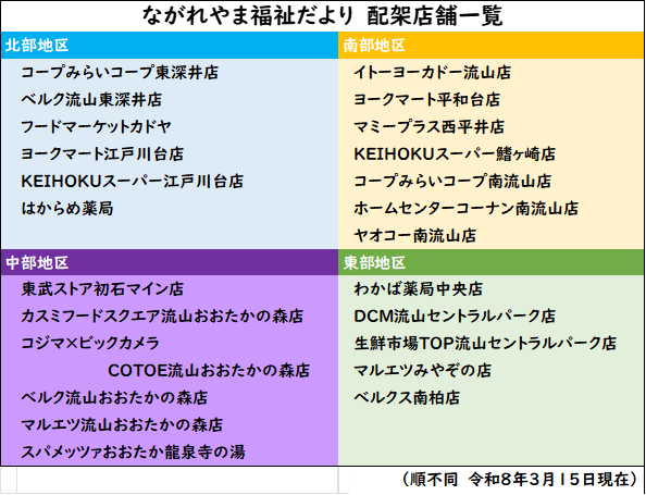 流山市社会福祉協議会では、『ながれやま福祉だより』の最新号を、新聞折込や右の表の流山市内のスーパー・ホームセンター等の店舗等で配布しています。